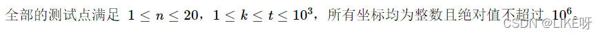 接下来 n 行,每行包含用空格分隔的 2t 个整数,按顺序表示一位居民过去 t 个时刻的位置记录 (x1,y1),(x2,y2),⋯,(xt,yt)。
