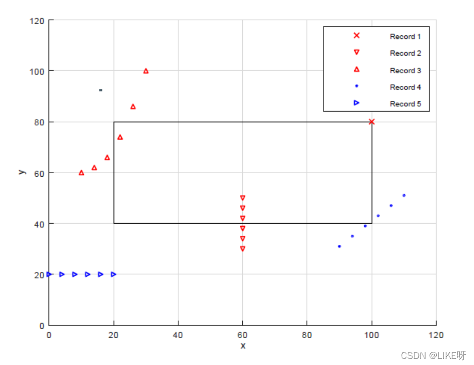 考虑某位居民的位置记录,如果其中某个坐标位于矩形内(含边界),则说明该居民经过高危区域;进一步地,如果其中连续 k 个或更多坐标均位于矩形内(含边界),则认为该居民曾在高危区域逗留。需要注意的是,判定经过和逗留时我们只关心位置记录中的 t 个坐标,而无需考虑该居民在 i 到 i+1 时刻之间位于何处。