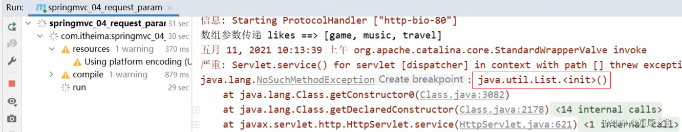 错误的原因是:SpringMVC将List看做是一个POJO对象来处理,将其创建一个对象并准备把前端的数据封装到对象中,但是List是一个接口无法创建对象,所以报错。