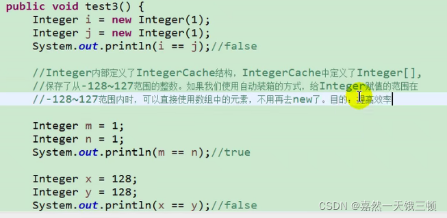 第一个比较地址值,第二个拆箱比较数值,第三个超出了Integer缓存的范围数字