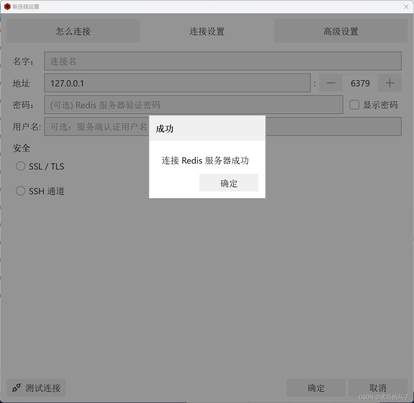 连接步骤 点击 左上方 加号 点击连接设置 点击连接测试,出现如下则表示你成功了