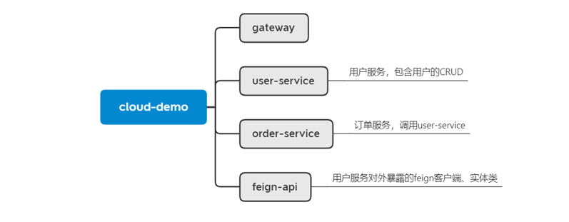 下面,我们的目标是将Sentinel集成到 cloud-demo 项目中,cloud-demo 是一个简单的微服务项目demo,其结构如下图所示: