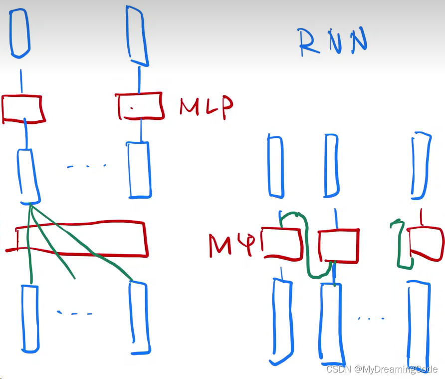 Transformer与RNN对于序列信息的使用(左Transformer 右RNN):