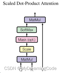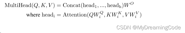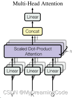 V、K、Q进入线性层(投影到比较低的维度),放入Scaled Dot-Product Attention中做h次(多头)运算并得到h个输出,将这些向量合并在一起,最后做一次线性投影。