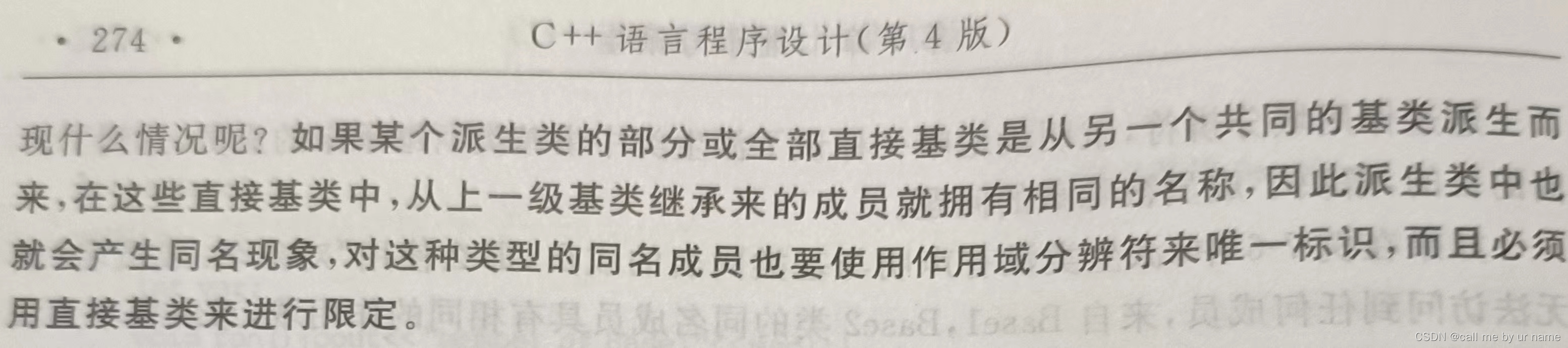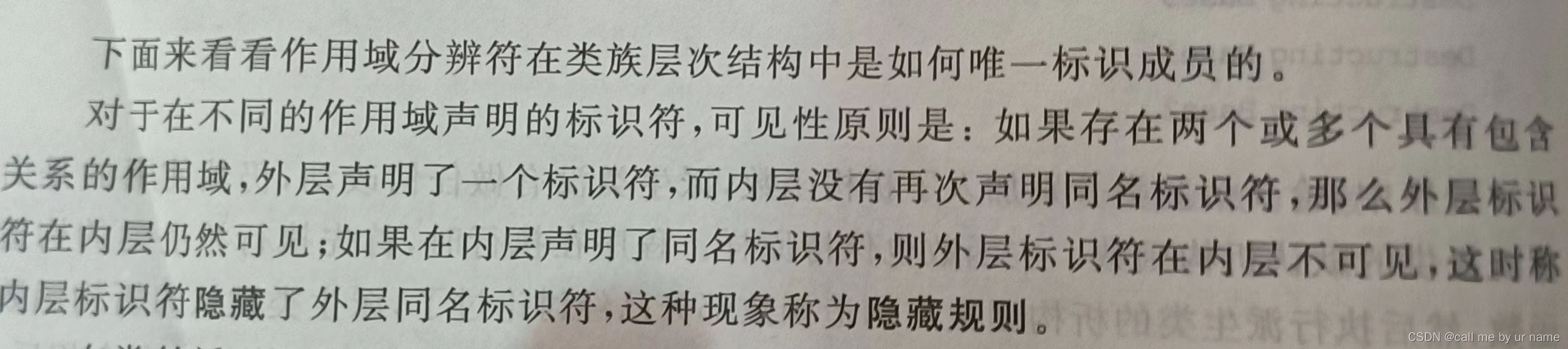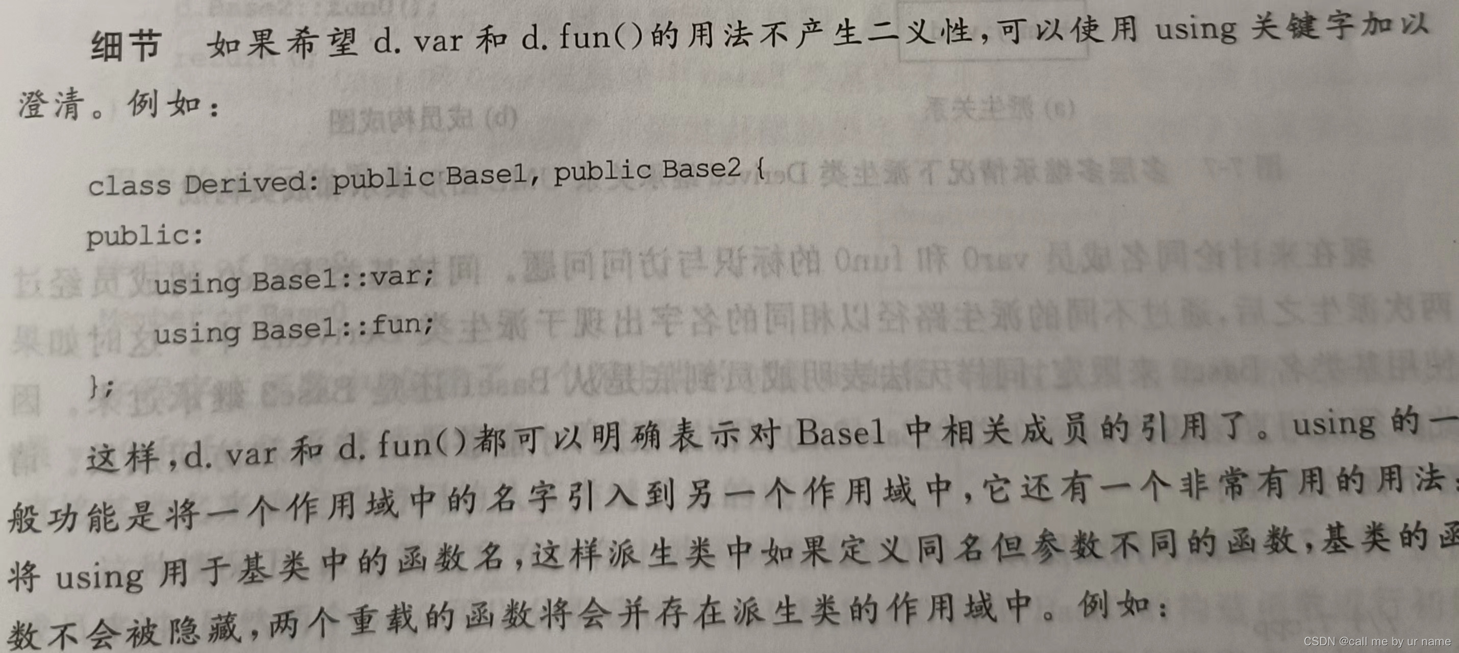 如果派生类声明了一个和某基类成员同名的新成员(如果是成员函数,则参数表也要相同,参数不同的情况属于重载),派生类的新成员就隐藏了外层同名成员。(这一句是书上原话,可能是我没理解好,但自己测试的情况是——派生类声明了同名成员函数,既使参数表不同,也用不了基类的相应成员函数,而且这句话跟后面好像也矛盾了)