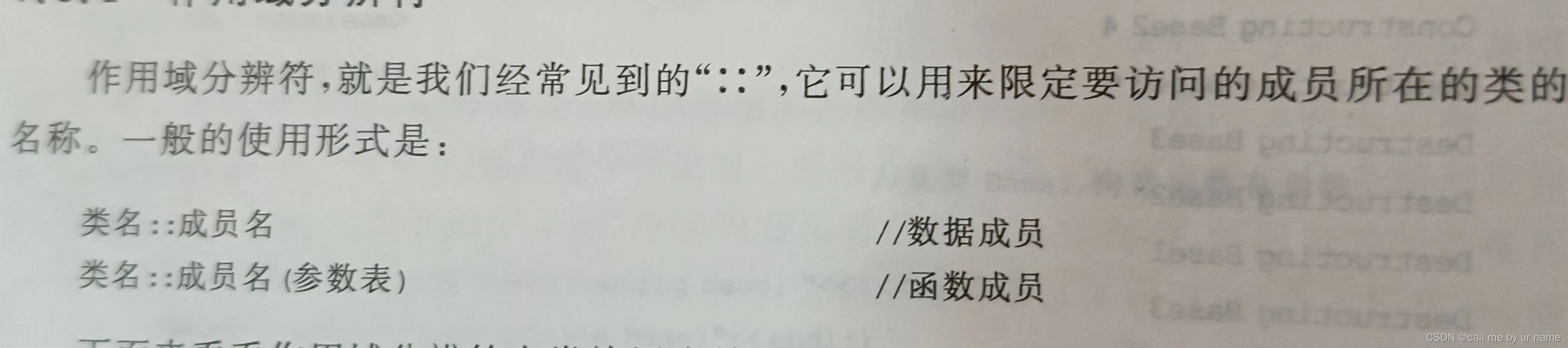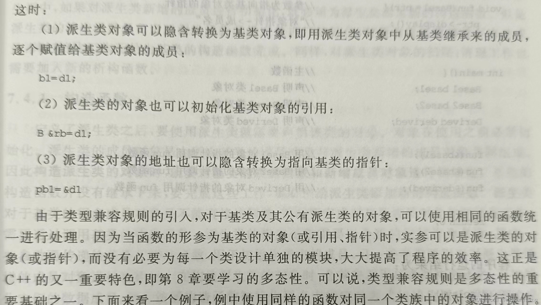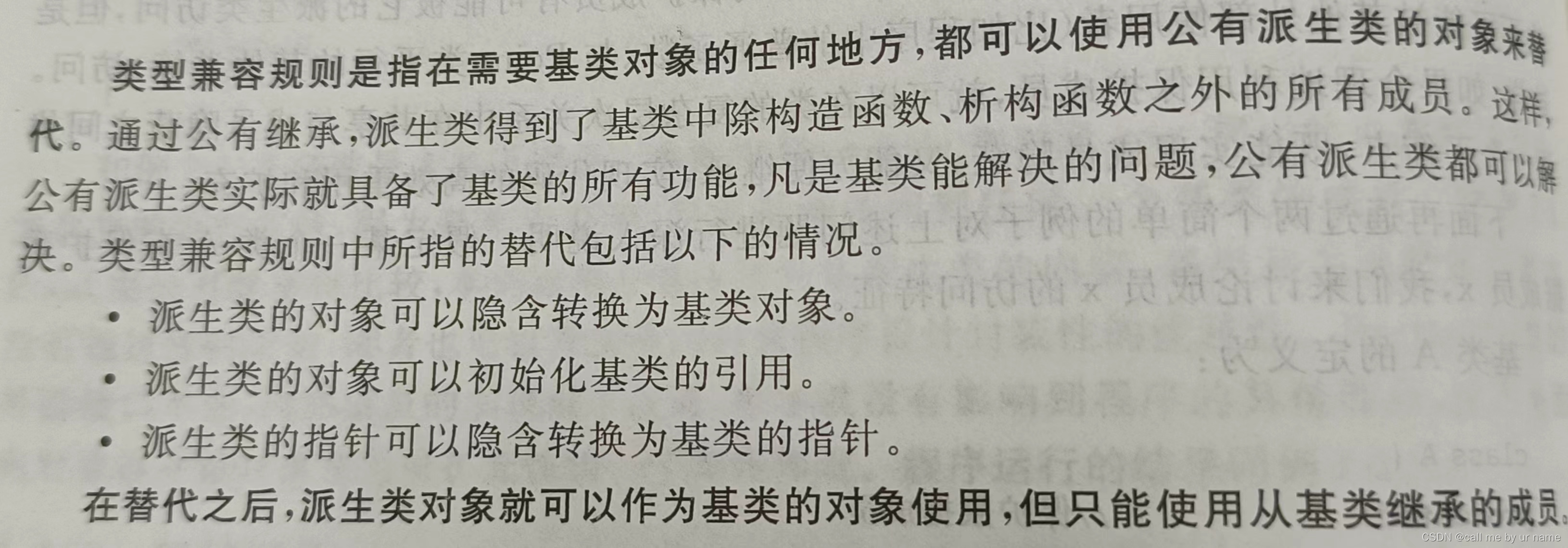 如果派生类声明了一个和某基类成员同名的新成员(如果是成员函数,则参数表也要相同,参数不同的情况属于重载),派生类的新成员就隐藏了外层同名成员。(这一句是书上原话,可能是我没理解好,但自己测试的情况是——派生类声明了同名成员函数,既使参数表不同,也用不了基类的相应成员函数,而且这句话跟后面好像也矛盾了)