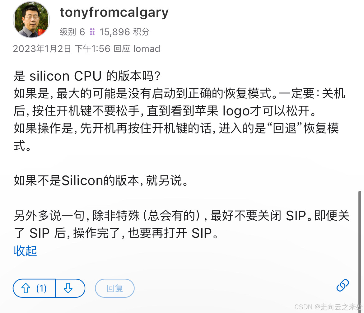 如果报错,执行第三步括号中操作,进入“正确的恢复模式”而不是“回退恢复模式””,打开sip这一步非常重要,这玩意儿相当于你系统层级的防火墙