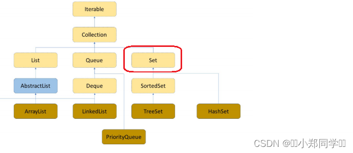 Set和Map一样也是Java集合中一种专门用来进行搜索的容器或者数据结构,它一样适合多态查找(查找时能进行一些插入和删除的操作),Set与Map不同的是:①.Set是继承自Collection的接口类。②.Set中只存储了Key。