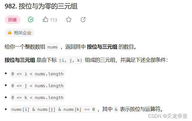 考虑到题目的要求是三元组的与&结果为0,而对于三元组很容易想到的一个优化是先做二元组,此时我们把二元组用hash存储以降低时间复杂度,注意到数据范围在 [0,),那么显然nums[i]&nums[j]也处于这个范围[0,