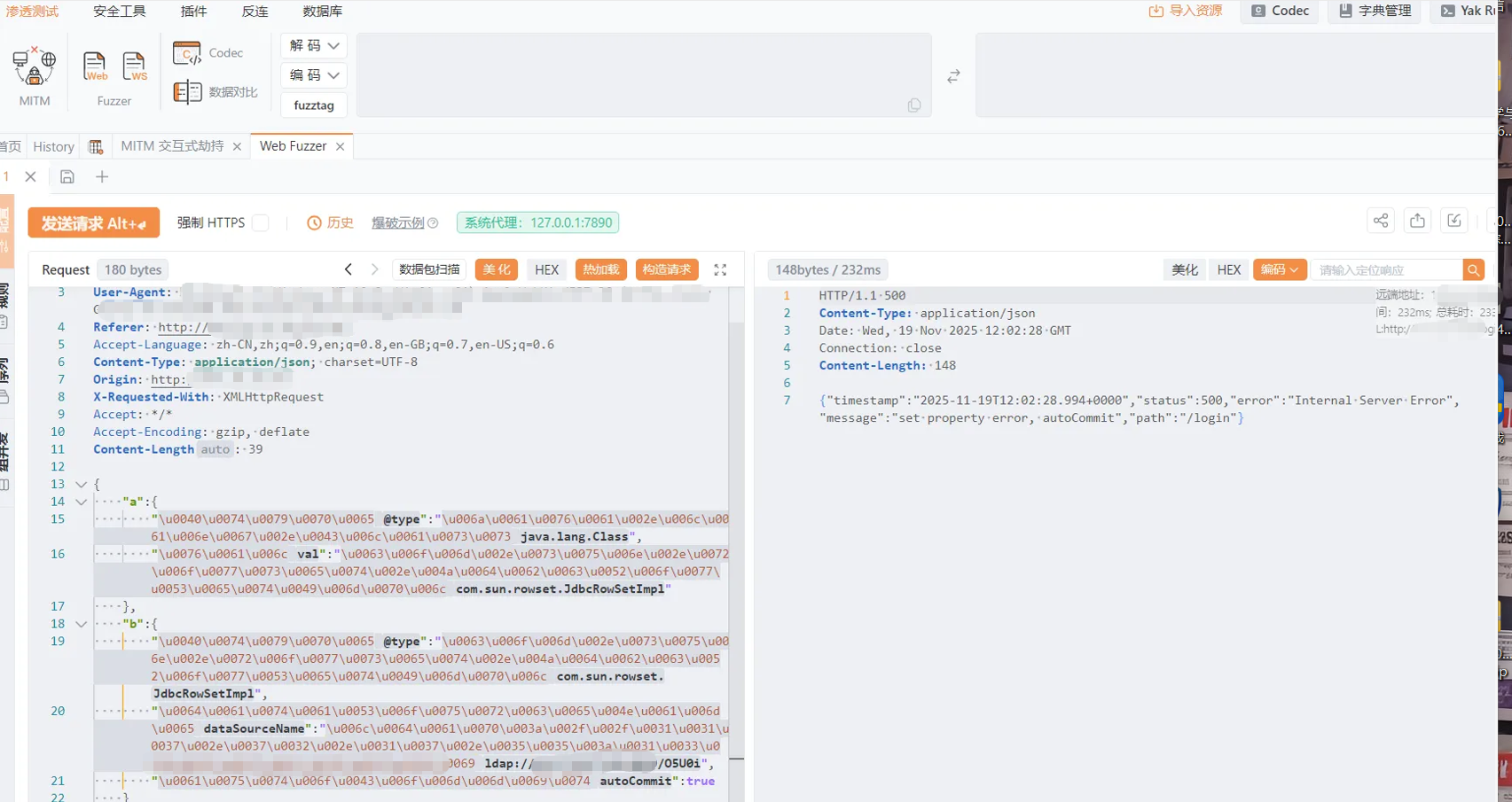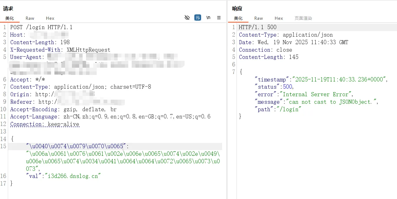 4.我们编码尝试一下(尝试使用unicode或者hex编码来处理payload,因为fastjson默认解析这两种编码。)使用unicode编码发现绕过成功