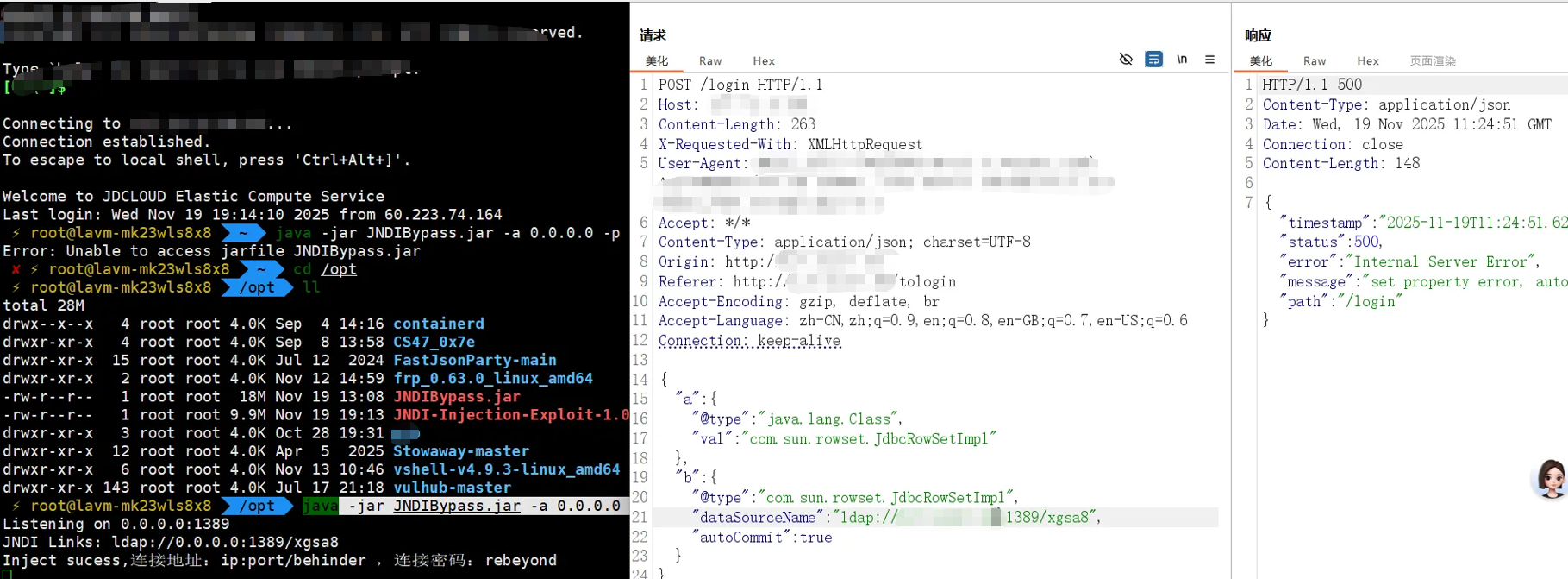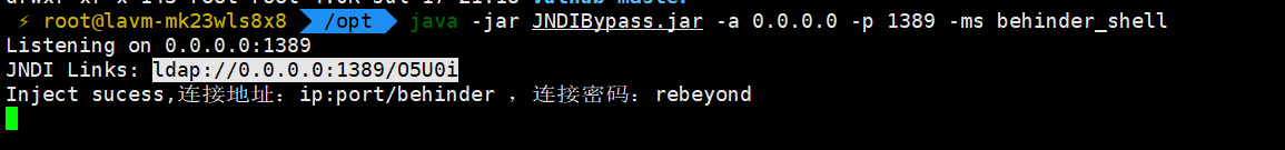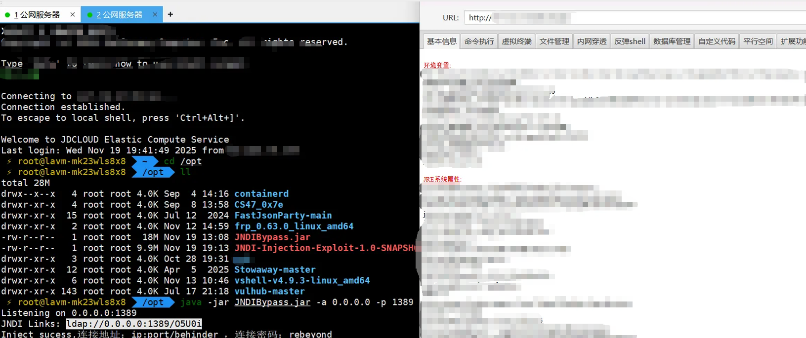 8.换个方式,我们把JNDIBypass.jar工具放到公网上,执行命令,在请求包中构造请求,连接JNDIBypass.jar给的链接