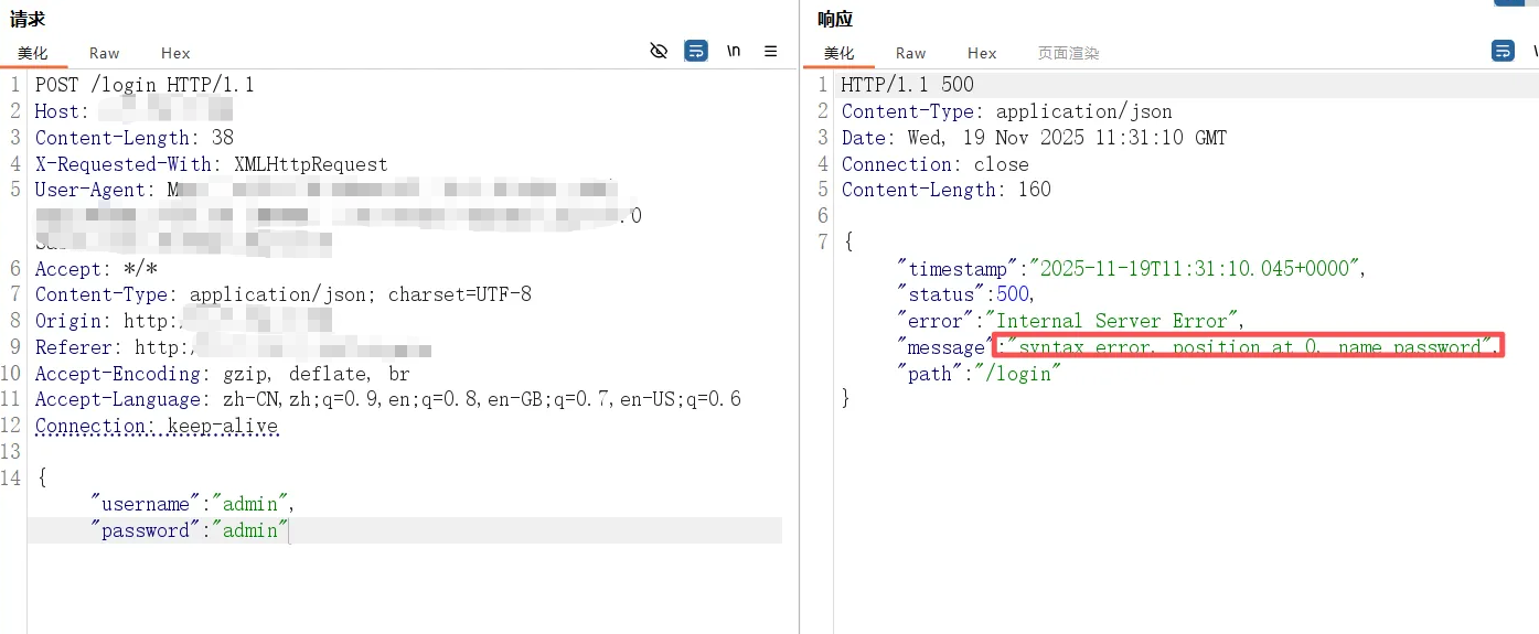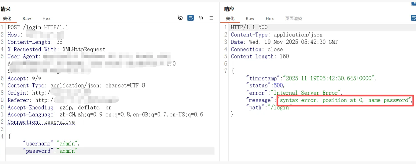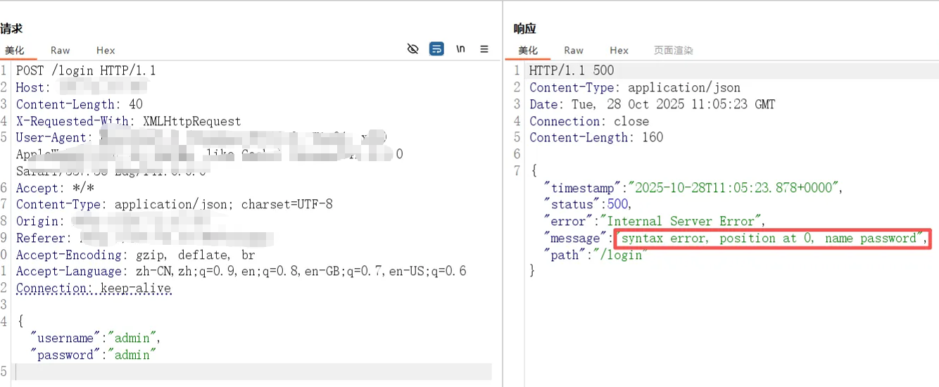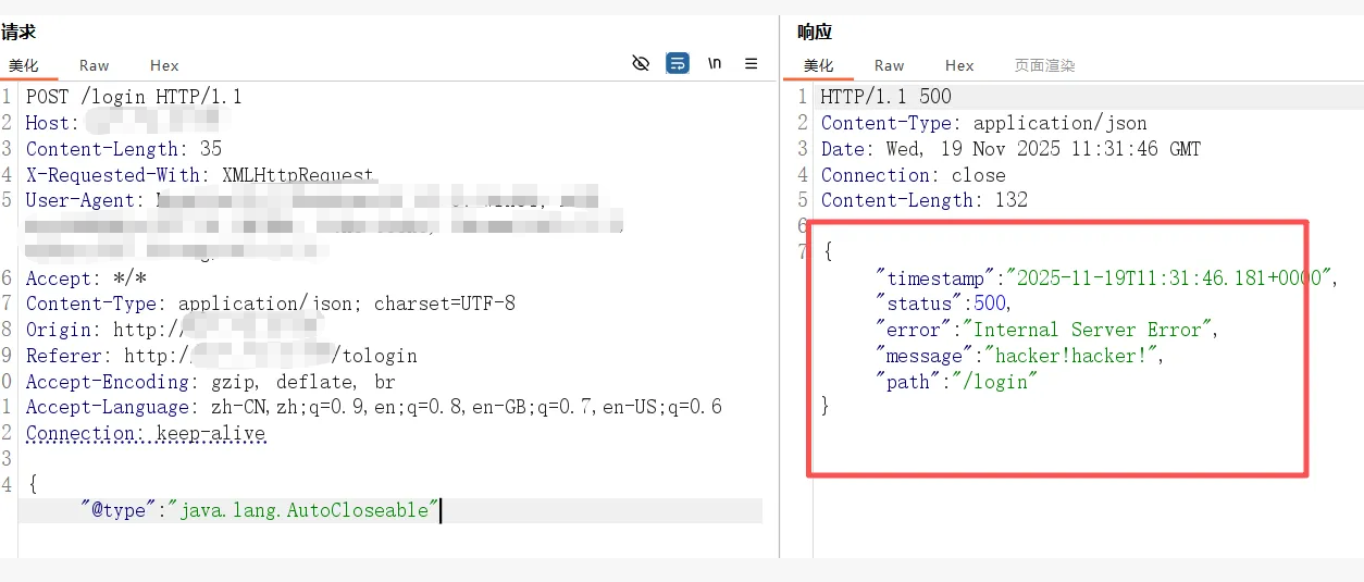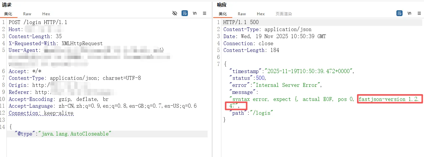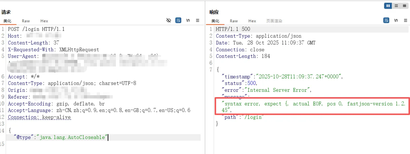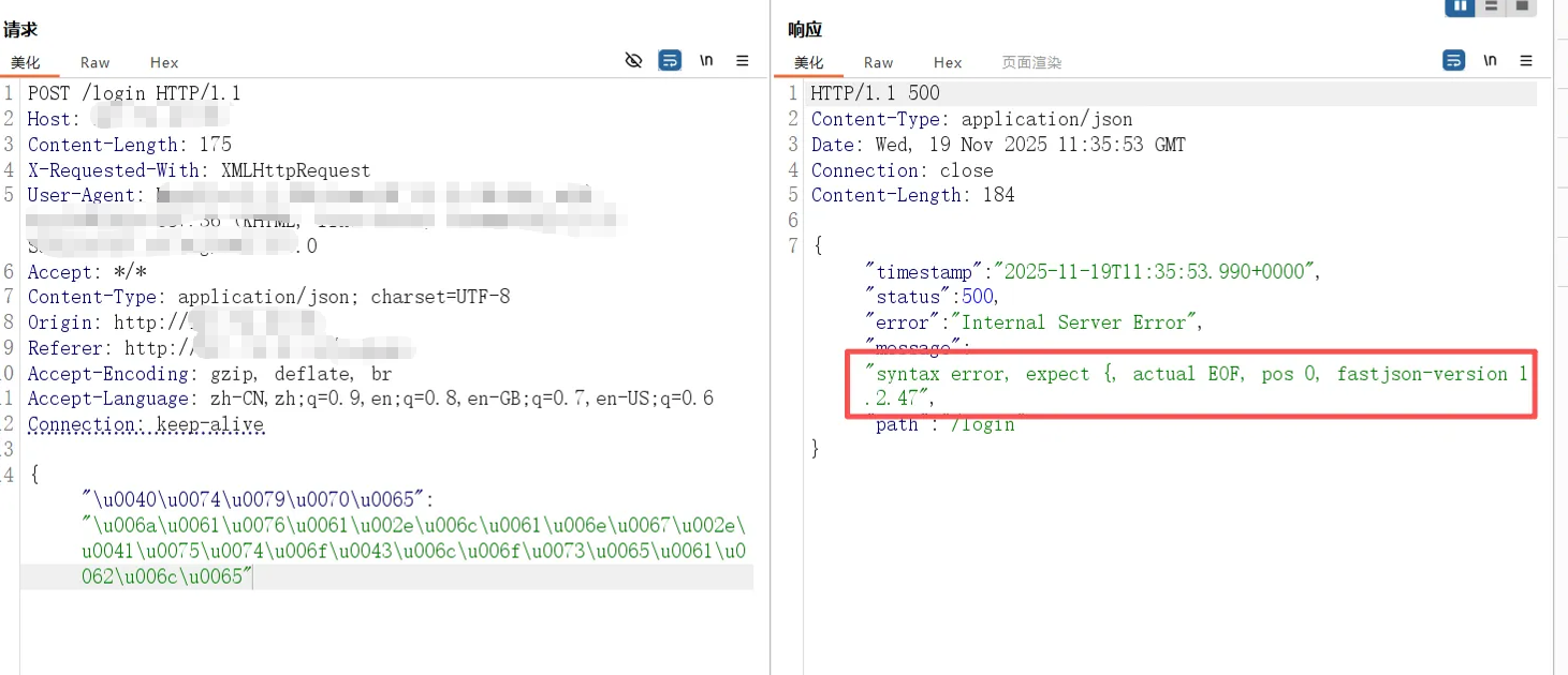4.我们构造报错看看(删除最后一个花括号),确认是fastjson