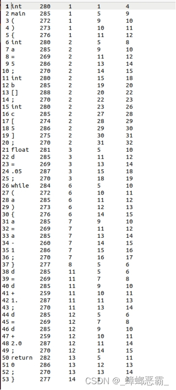 题目要求能够输出识别出的token,type ,line(刚出现的行数),pos_start(该行开始位置),pos_end(结束的位置,不包含) 。