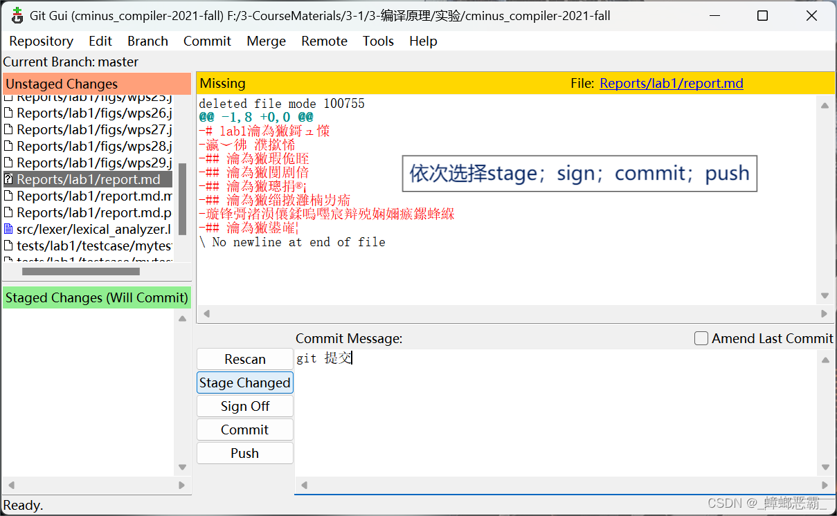 b.依次选择stage,sign,commit,push.(sign off时可以在右下角的框里输入提交信息)