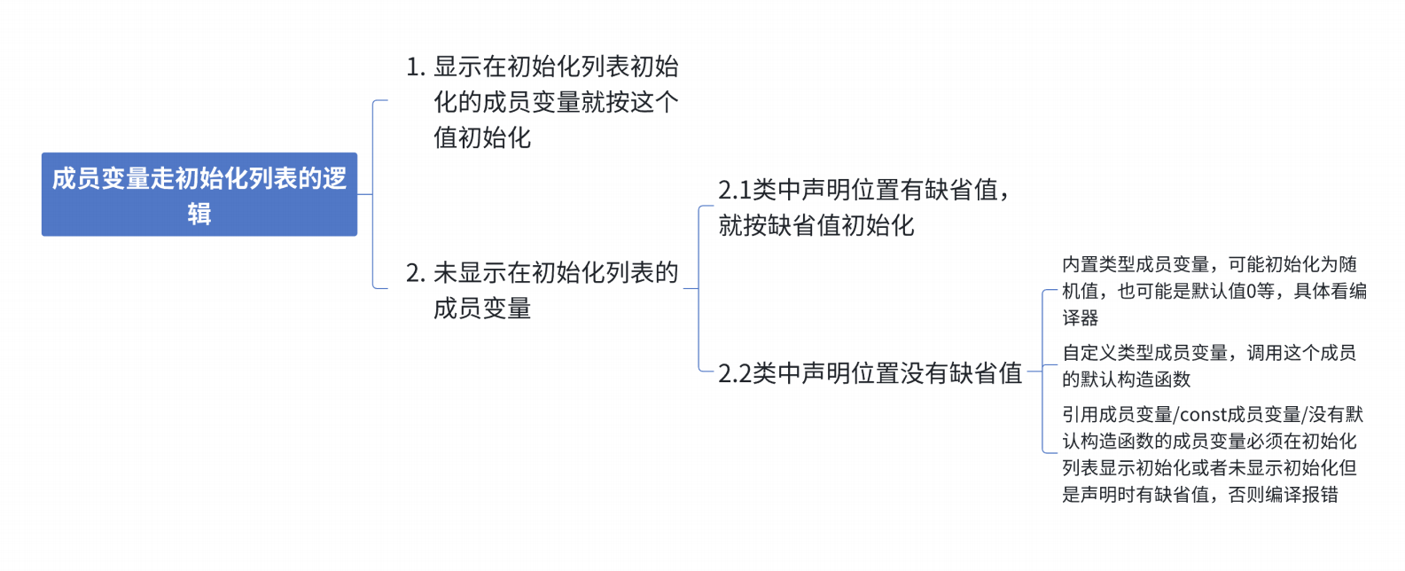- 尽量使用初始化列表初始化,因为那些你不在初始化列表初始化的成员也会走初始化列表,如果这个成员在声明位置给了缺省值,初始化列表会用这个缺省值初始化。如果你没有给缺省值,对于没有显示在初始化列表初始化的内置类型成员是否初始化取决于编译器,C++并没有规定。对于没有显示在初始化列表初始化的自定义类型成员会调用这个成员类型的默认构造函数,如果没有默认构造会编译错误。