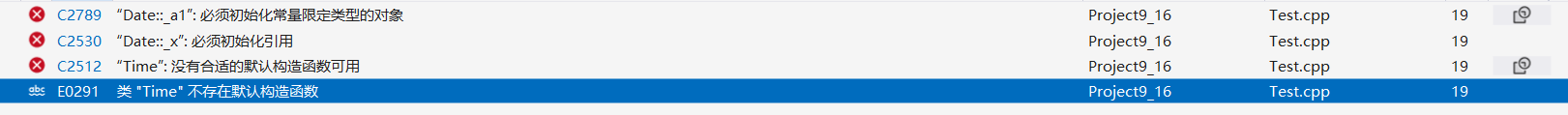 #include<iostream> using namespace std; class Time { public: Time(int hour):_hour(hour) {} private: int _hour; }; class Date { public: Date(int year, int month, int day, int& x) :_year(year) , _month(month) , _day(day) , t(13) ,_x(x) ,_a1(1) {} private: int _year; int _month; int _day; Time t; int& _x; const int _a1; }; int main() { int x = 0; Date d1(2025, 9, 16, x); return 0; }如果我们将初始化列表的后三个给注释,就会发生错误,如下所示: