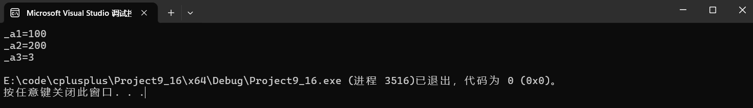 #include<iostream> using namespace std; class A { public: A():_a1(100),_a2(200) {} void Print() { cout << "_a1=" << _a1 << endl; cout << "_a2=" << _a2 << endl; cout << "_a3=" << _a3 << endl; } private: int _a1 = 1; int _a2 = 2; int _a3 = 3; }; int main() { A a; a.Print(); return 0; }输出如下所示: