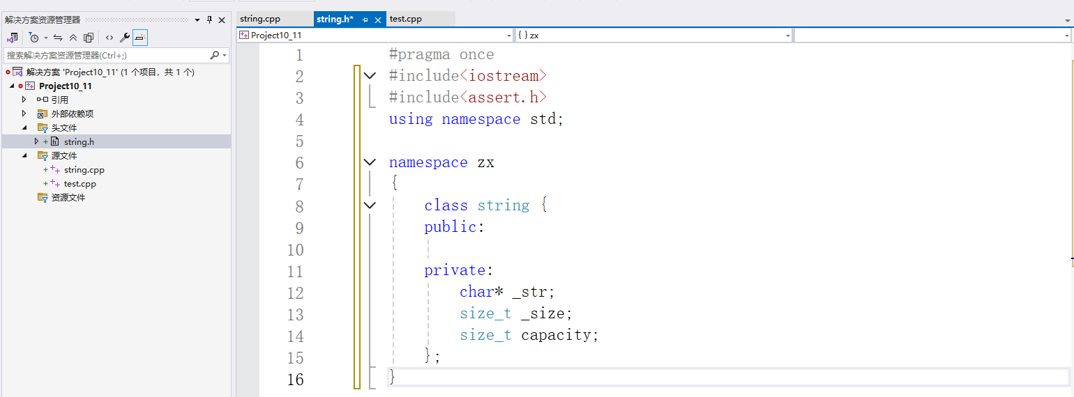我们在test.cpp里面来调用这个测试函数:zx::string_test1();