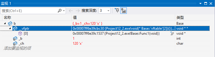 解析:上面题目运行结果12bytes,除了_b和_ch成员,还多一个__vfptr放在对象的前面(注意有些平台可能会放到对象的最后面,这个跟平台有关),对象中的这个指针我们叫做虚函数表指针(v代表virtual,f代表function)。一个含有虚函数的类中都至少都有一个虚函数表指针,因为一个类所有虚函数的地址要被放到这个类对象的虚函数表中,虚函数表也简称虚表。