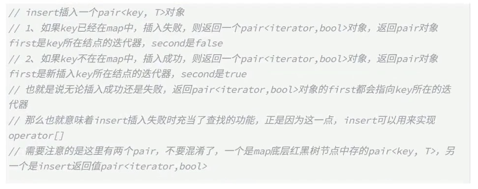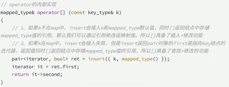 如果key在map之中,insert就会插入失败,但是insert会返回这个节点的迭代器和false,然后返回mapped_type的引用,那我们就可以通过这个引用来修改,所以[]具备了查找和修改的功能。