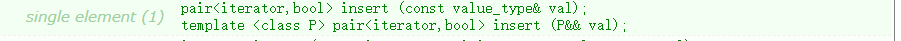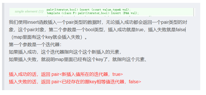 单个元素的插入会返回一个pair类型的对象,这个对象有两个元素,第一个元素是插入元素的迭代器,第二个元素是一个bool类型,表示是否插入成功。pair类型在下面讲map的时候讲解。