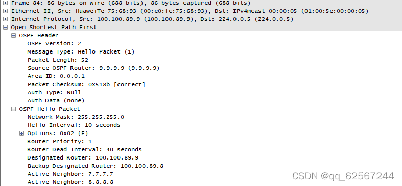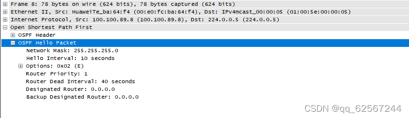 OSPF 路由器在DR/BDR未选举出来之前,Hello报文中关于DR和 BDR的字段为全0,即为0.0.0.0。选举完成后,DR和 BDR 的字段记录已知的DR和BDR的RouterID。