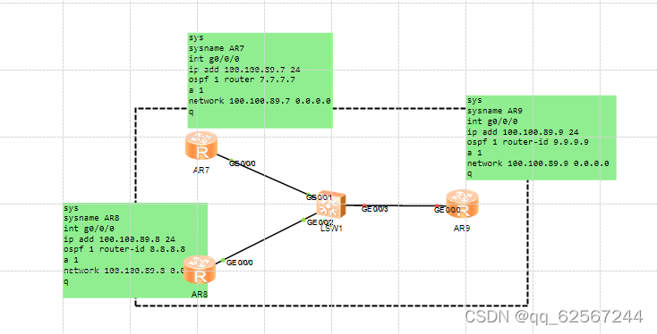 Hello报文开始相互交互,由于未收到含有DR和BDR非空字段的Hello报文,wait定时器超时开始进行BDR的选举,DRother集合中包含AR7,AR8,AR9,通过比较优先级和RID大小先将RID为9.9.9.9的路由器选举为BDR,再将9.9.9.9选举为DR,在进行选举BDR,将RID为8.8.8.8的路由选举为BDR