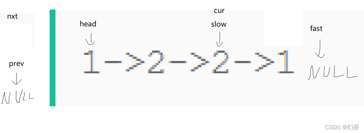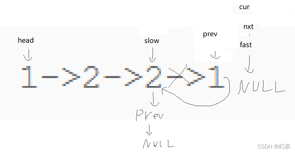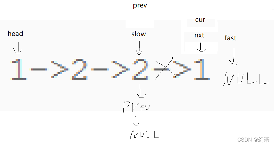 struct ListNode* slow,*fast,*cur,*nxt,*prev;