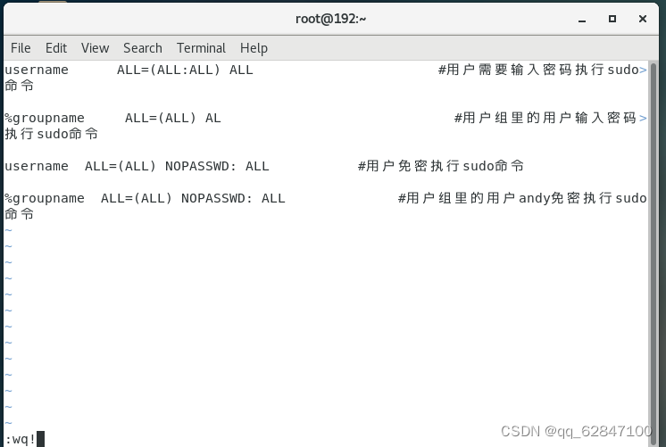 %groupname ALL=(ALL) NOPASSWD: ALL #用户组里的用户andy免密执行sudo命令