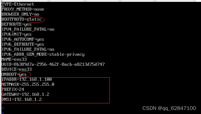BOOTPROTO=static ONBOOT=yes IPADDR=192.168.1.100 NETMASK=255.255.255.0 PRFIX=24 GATELAY=192.168.1.2 DNS1=114.114.114.114