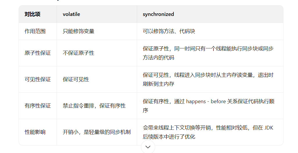 volatile不能保证原子性。例如,对volatile修饰的变量进行自增(i++)操作,这是一个复合操作(读取 - 修改 - 写入),在多线程环境下,可能会出现线程安全问题,无法保证操作的原子性。 - volatile不能解决指令交错问题,所以不能保证原子性