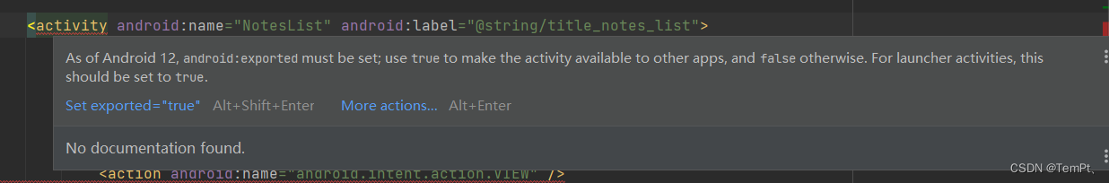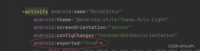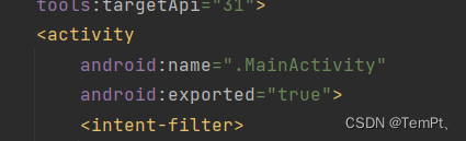 sdk版本是31或者当你升级到31你新建一个activity时会发现在manifest中的activity属性中默认会出现android:exported="true"属性,其作用就是用来标示:当前Activity是否可以被另一个Application的组件启动:true允许被启动;false不允许被启动。