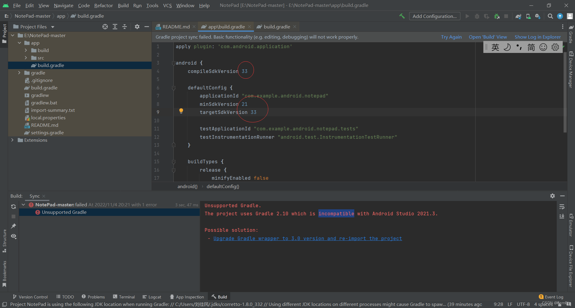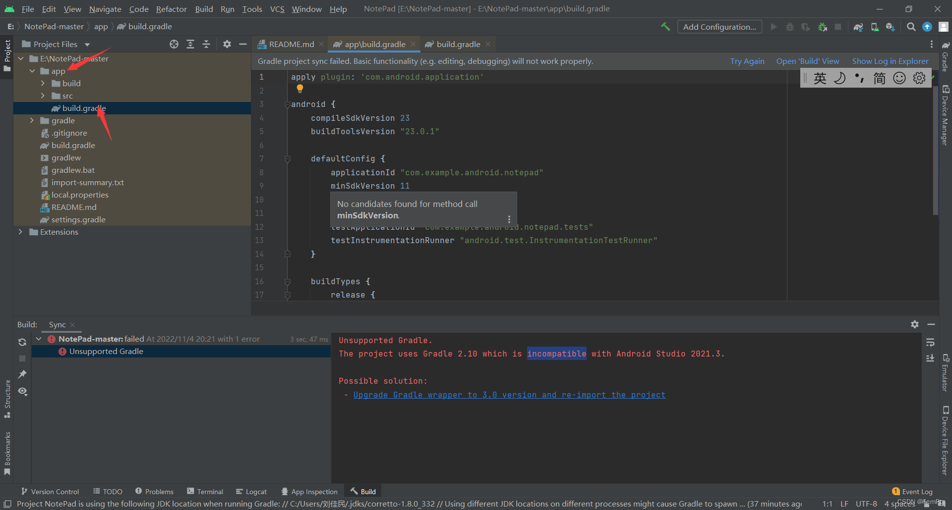打开后是这样的,提示当前版本的gradle与项目不匹配