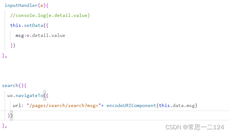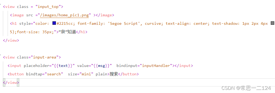 搜索区有两行,第一行显示搜索图标与文字提示(没什么用起装饰作用),第二行为搜索框与搜索按钮。搜索框会将输入文本传给变量,搜索按钮会跳转相应所绑定的搜索函数。相应的在.js文件里写好相应的函数。
