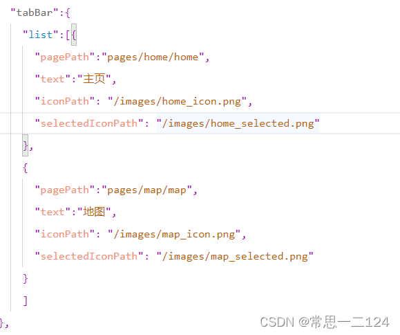 该页面的最低端是tabBar导航区,我设置了两个区域分别是主页面与地图区域,由于tapbar是针对整体项目的,所以它要在全局配置的app.json文件中进行设置,在文件中设置"tabBar"属性设置好相应的图标、文字说明与跳转页面路径即可,如下图所示。