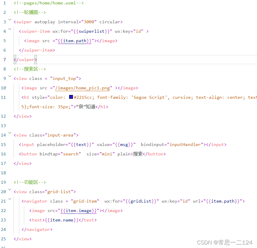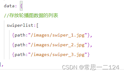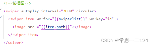轮播图区的实现十分简单,在wmxl文件里按固定格式写好<swiper>组件,其中的属性:autoplay表示自动播放,interval表示播放间隔,circular表示循环播放。接着在css文件里设置好尺寸,在js文件里配置好想要轮播的图片即可(图片既可以是本地路径也可以是网页连接)。