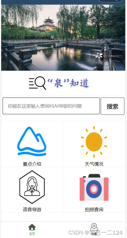 可以看到,该页面主要由四部分组成分别是顶层的轮播图,中部的搜索区和功能区(景点介绍、天气情况等)以及底部的tabBar导航区。