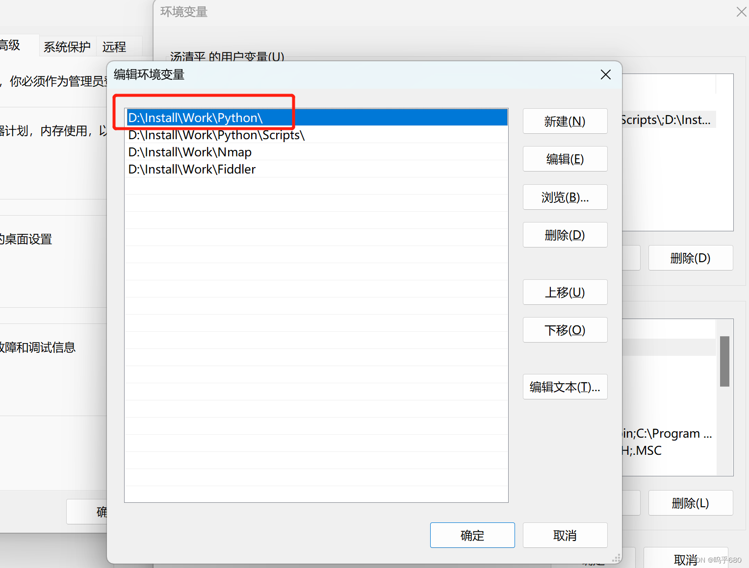 但是发现环境变量中并没有对python进行配置,于是我在环境变量path中新增了python变量,并且进行置顶,这儿是我的python的安装位置:D:\Install\Work\Python\。