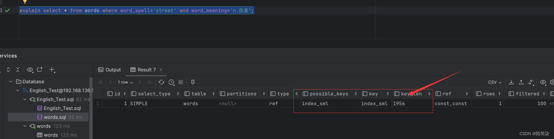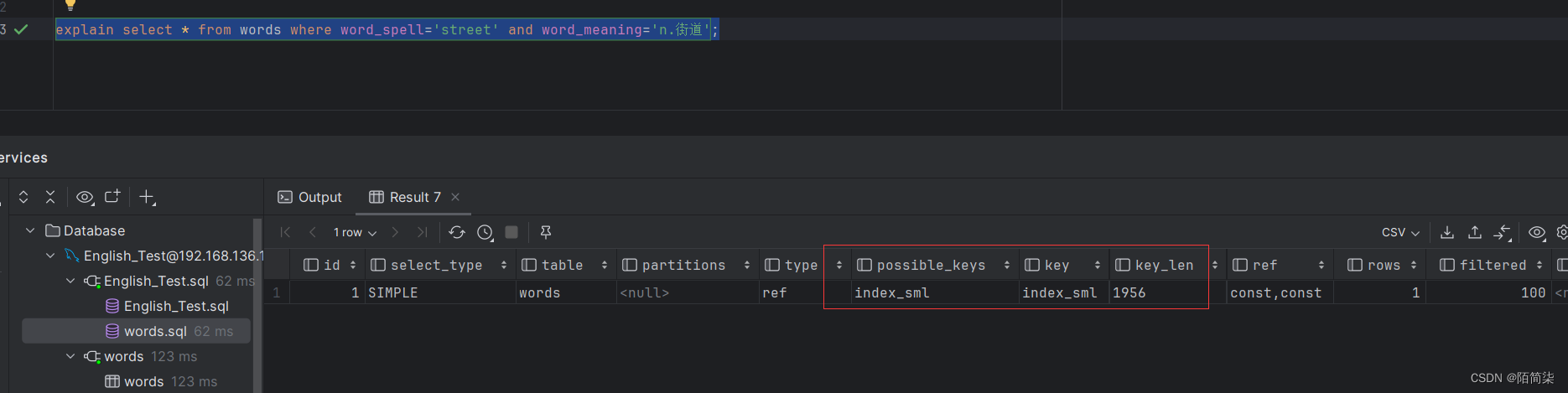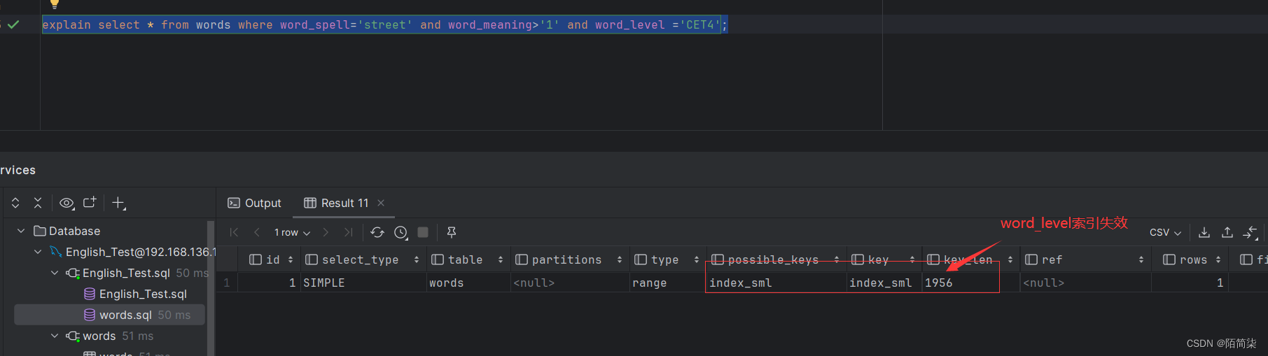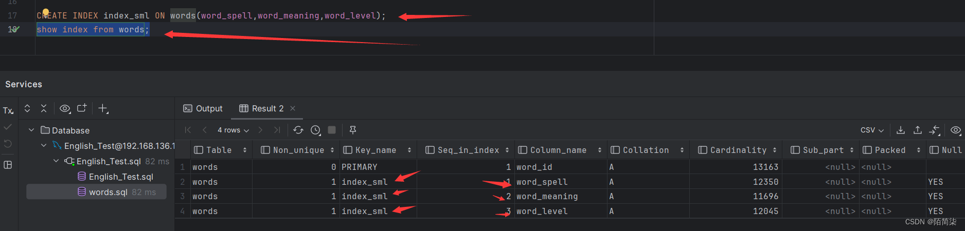 准备一张表名为words,约有12万条数据。为word_spell,word_meaning,word_level三个创建一个复合索引名为index_sml。查看结果