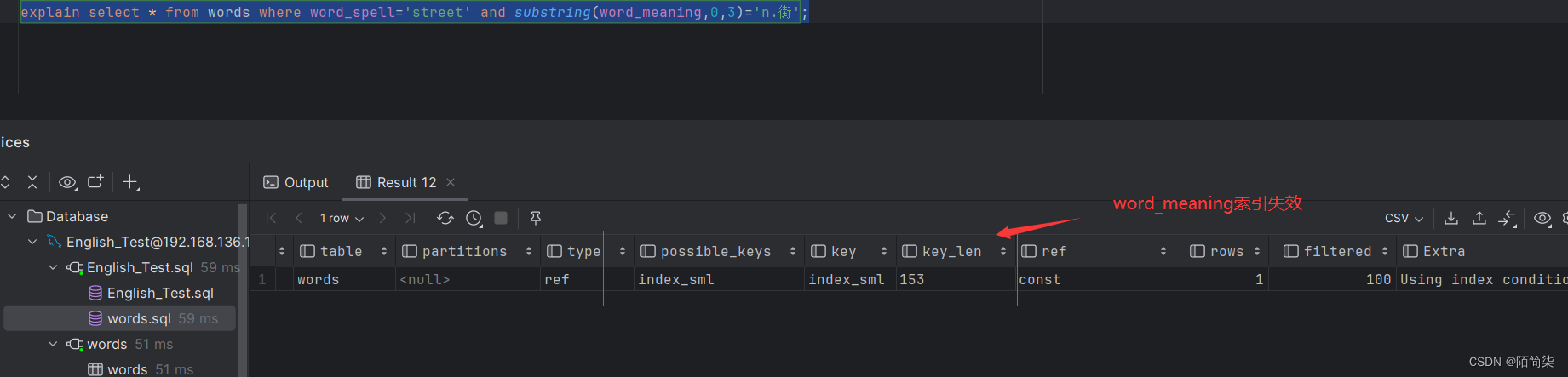 explain select * from words where word_spell='street' and substring(word_meaning,0,3)='n.街';
