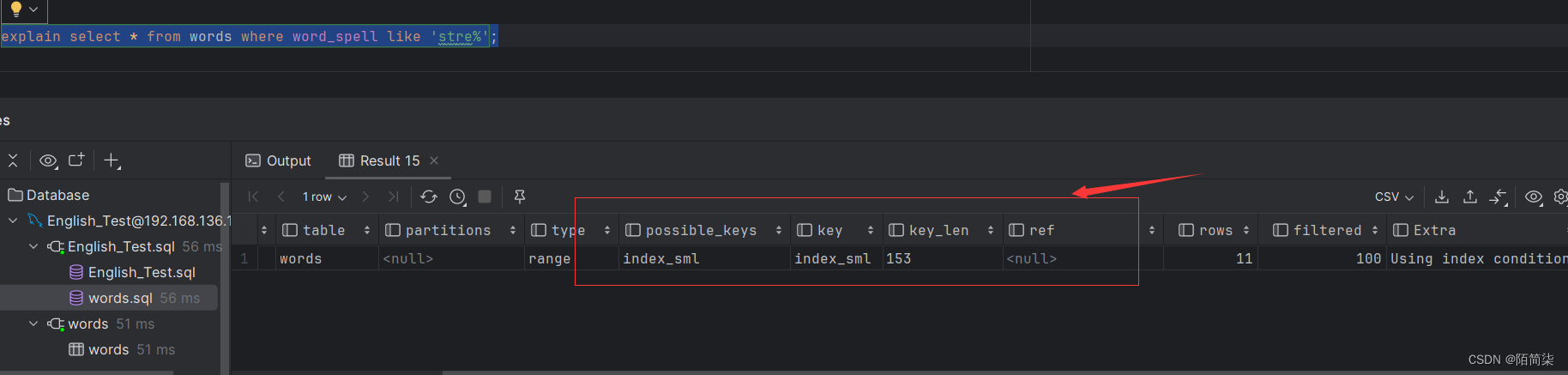 explain select * from words where word_spell like 'stre%';