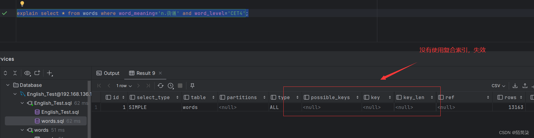 explain select * from words where word_meaning='n.街道' and word_level='CET4';