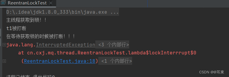 首先声明一个ReenTranLock锁,然后创建一个线程t1并且调用可打断的方法,首先主线程获取锁并且睡眠3秒,之后开启线程t1,观察控制台。