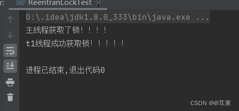 首先声明一个ReenTranLock锁,然后创建一个线程t1并且尝试获取锁传入等待时间例如4秒,首先主线程获取锁并且睡眠3秒,之后开启线程t1,观察控制台。