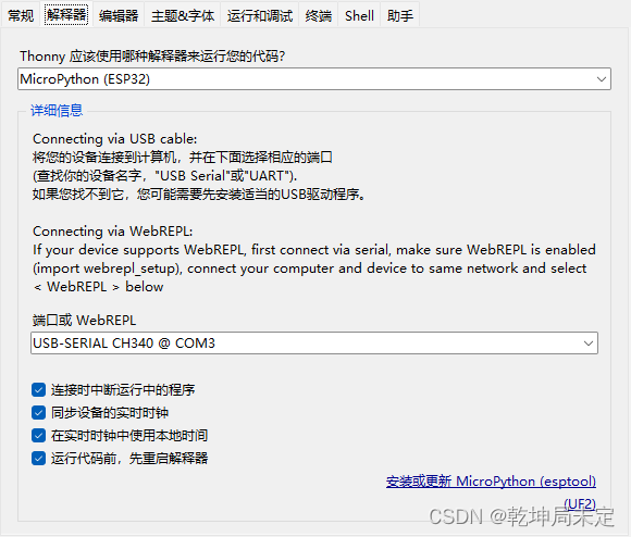 再thonny界面中 点击 运行——>配置解释器 选择MicroPython(esp32),端口选择COM3