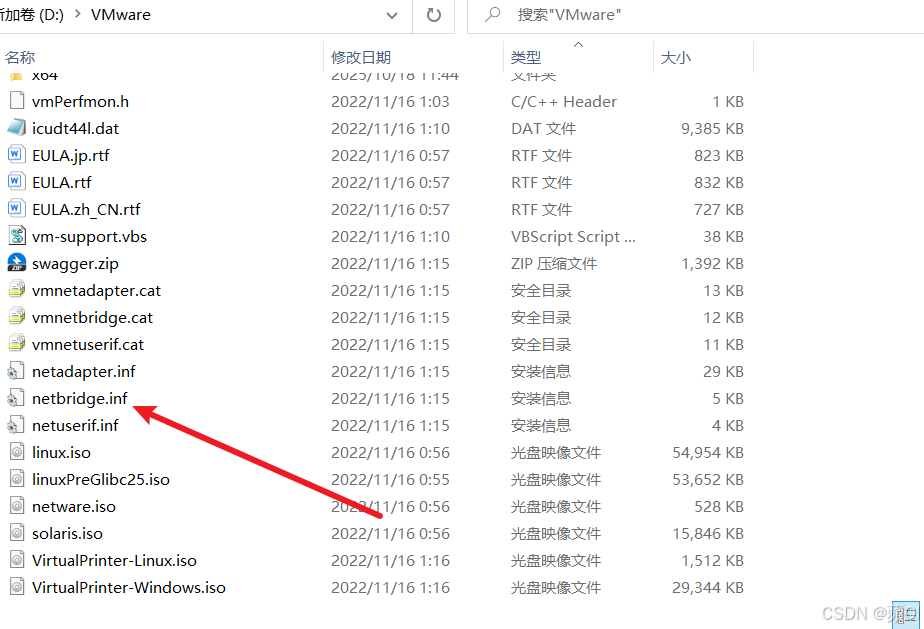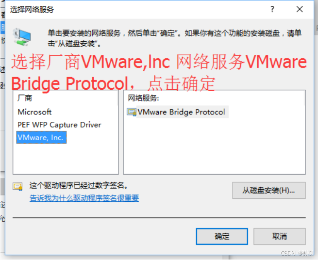 如果发现厂商下没有这个“Vmware Bridge protocol”服务,不用担心,我们去从磁盘中安装,去找到你安装VM虚拟机的目录,把netbridge.inf这个文件加载上去就好了。