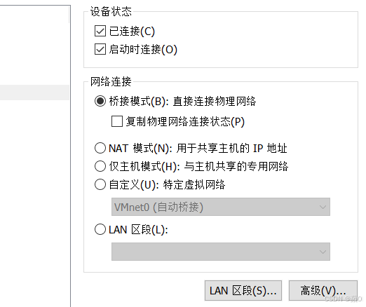 我遇到的问题二:设备"VMnet0"上的网桥没有运行,该虚拟机无法与此主机或网络上的其他主机进行通信。