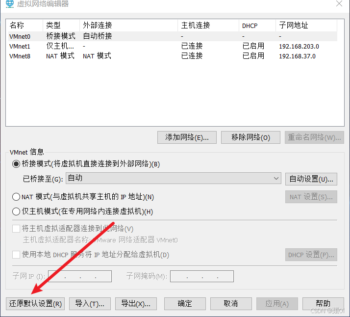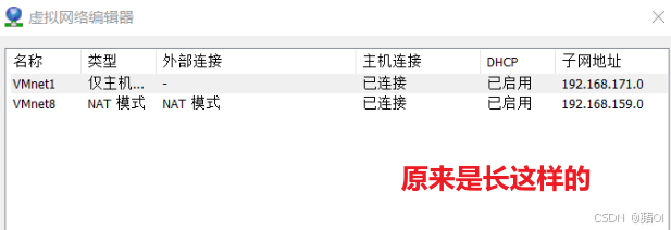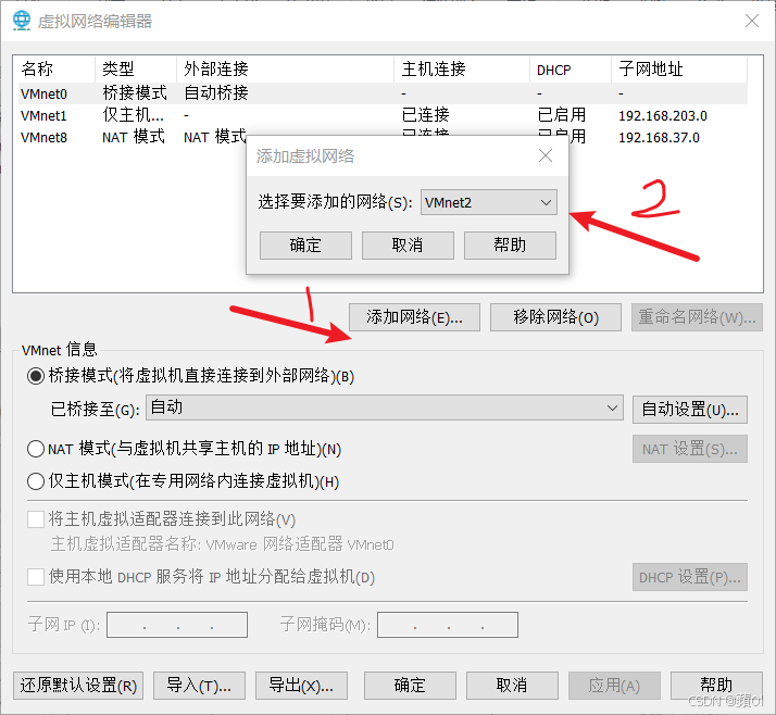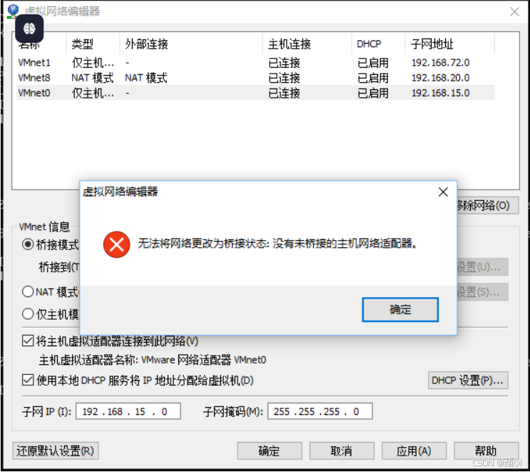 为了解决这个问题,就需要去修改虚拟机网络编辑器,在其中添加网络VMnet0,下图的我是提前添加好了,但是在这之前,我又发现一个新问题。