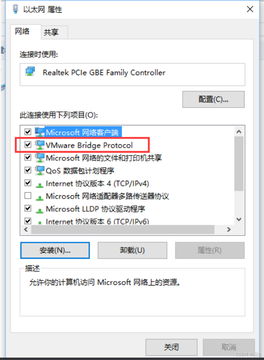 此时就有发现以太网属性中的网络多了“Vmware Bridge protocol”服务,之后就可以去正常去网络桥接了。