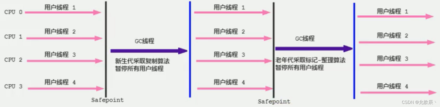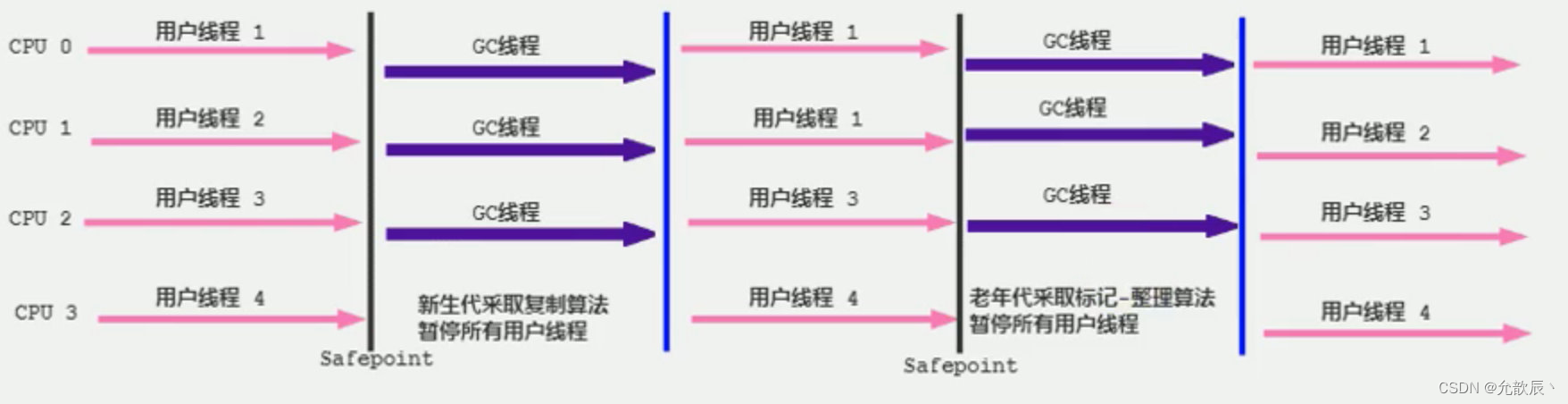可以看到,当进入到垃圾回收阶段时,所有的用户线程必须等待GC线程完成工作,就相当于你打一把LOL 40分钟,中途每隔1分钟网络就卡5秒钟,可能这时你正在打团,结果你被物理控制直接在那里站了5秒钟,这确实让人难以接受。